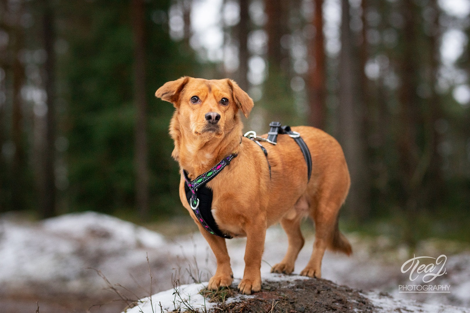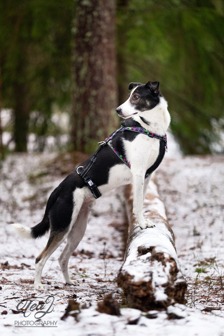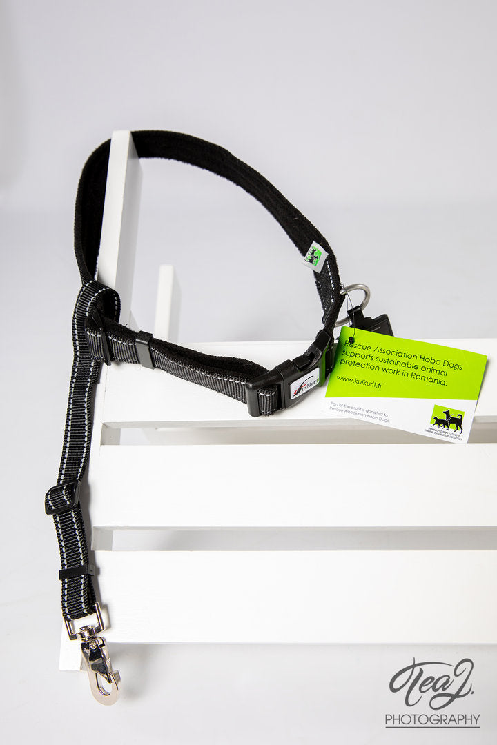 - lisäosa varmistaa valjaan pysymisen koiran yllä