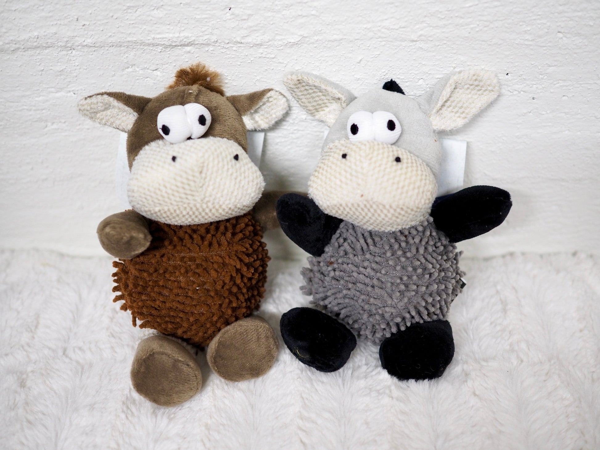 Söpöt ja hauskat pehmolelut, joissa vinku sisällä. Vaihtoehtoina ruskea lehmä tai harmaa aasi. Lelu on valmistettu erilaisista kankaista vaihtelevien tekstuurien aikaansaamiseksi, mikä kannustaa koiran leikkiin ja uteliaisuuteen.