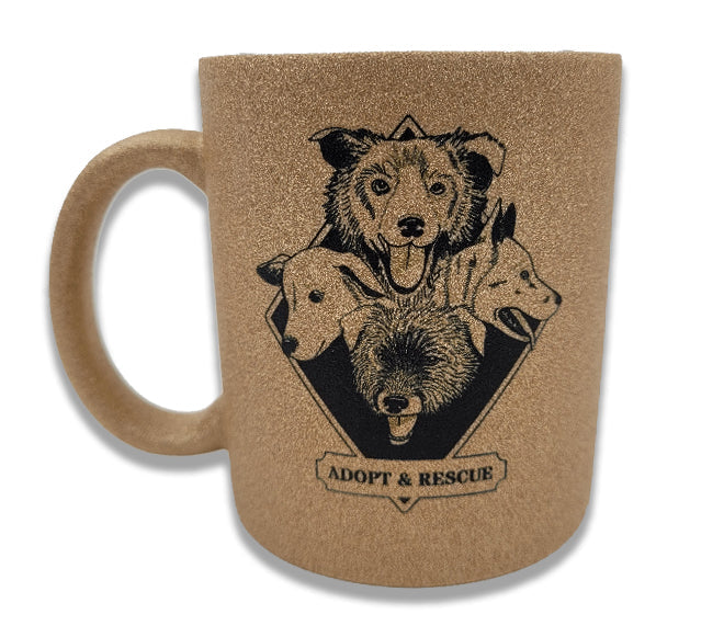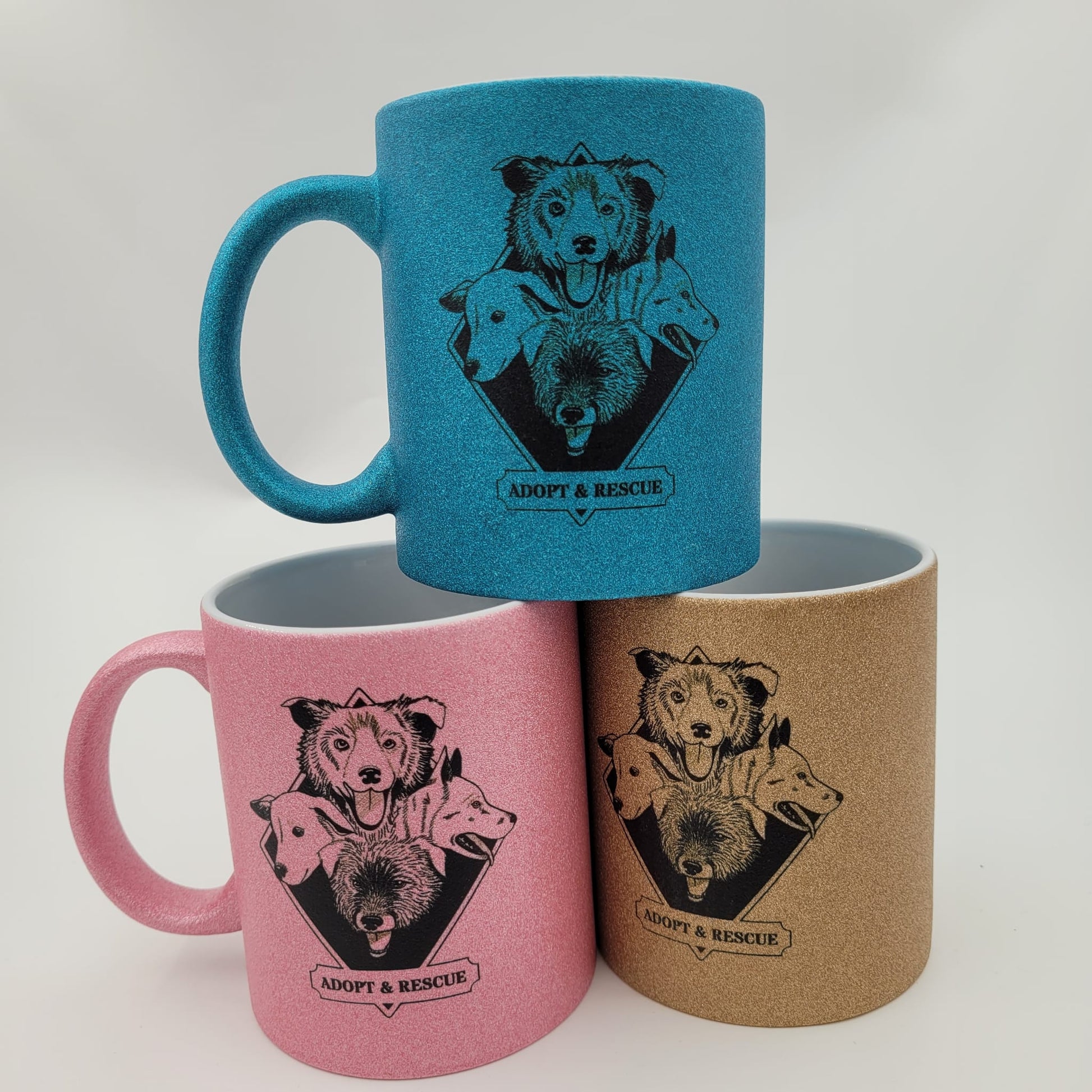 Tämä ihana ja varmasti erottuva kultainen glittermuki Adopt & Rescue-painatuksella piristää jokaisen päivää! Mukin vetoisuus noin 3.8dl ja piripintaan 4dl.