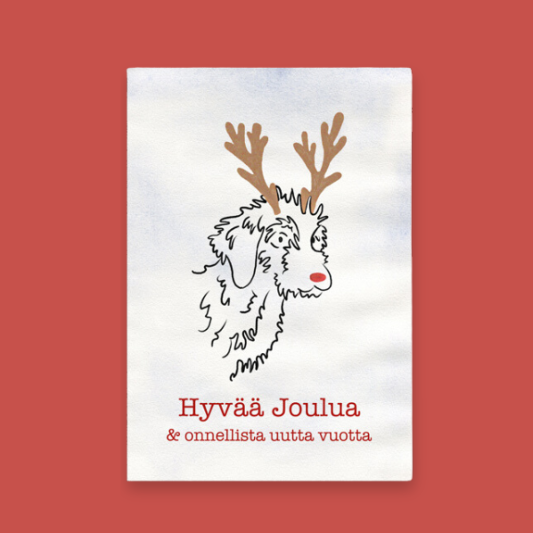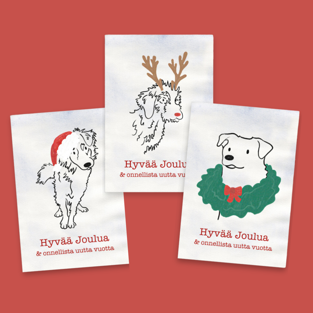 Upea Vilma Turkin suunnittelema joulukorttisetti "Koirat" on samaa sarjaa Koirien joulukalenterin kanssa, ja kortteja koristaa Kulkureidenkin adoptio-ohjelmasta tutut koirat. Nämä suloiset kortit ilahduttavat jouluna varmasti kaikkia koirien ystäviä!