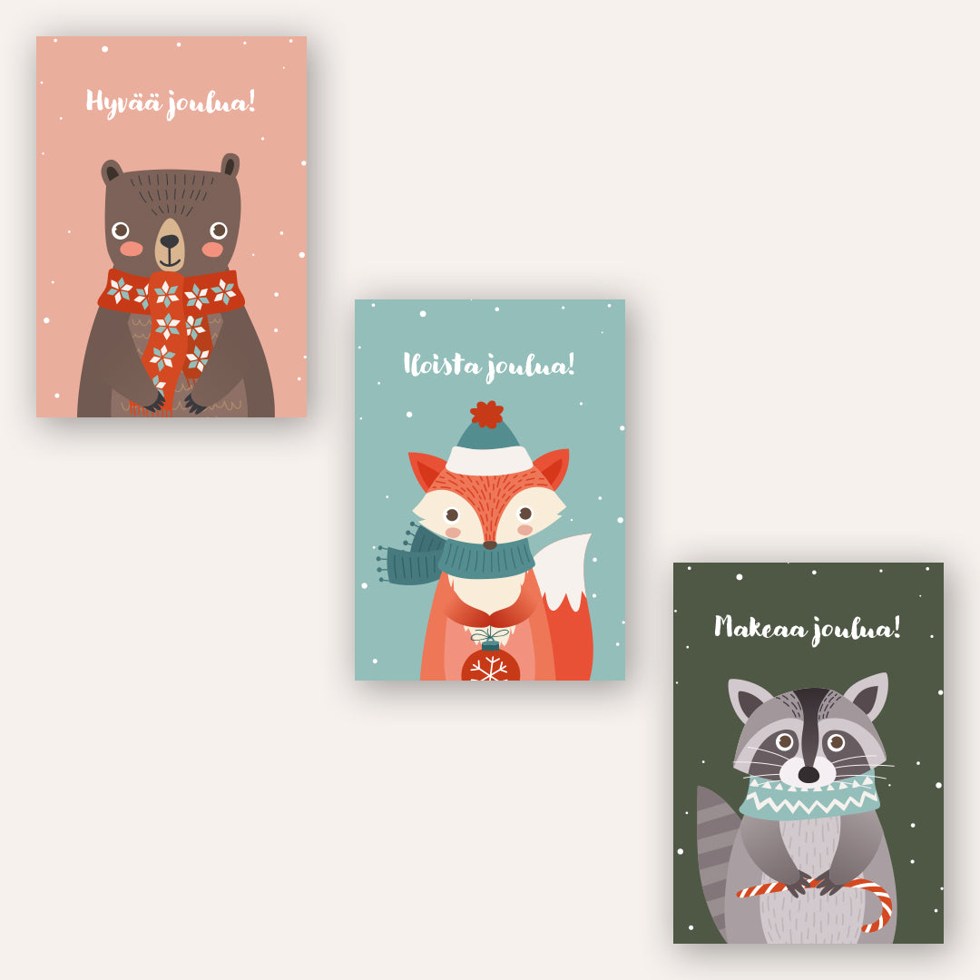 Jatta Palovuoren suunnittelema herttainen joulukorttisetti "Naapurit" on samaa sarjaa tämän vuoden lemmikkien joulukalenterin sekä ihmisten "Eläinystävät"- joulukalenterin kanssa, ja korteissa seikkailevat ihastuttavat metsän naapurit. Nämä suloiset kortit ilahduttavat jouluna varmasti kaikkia eläinten ystäviä!
