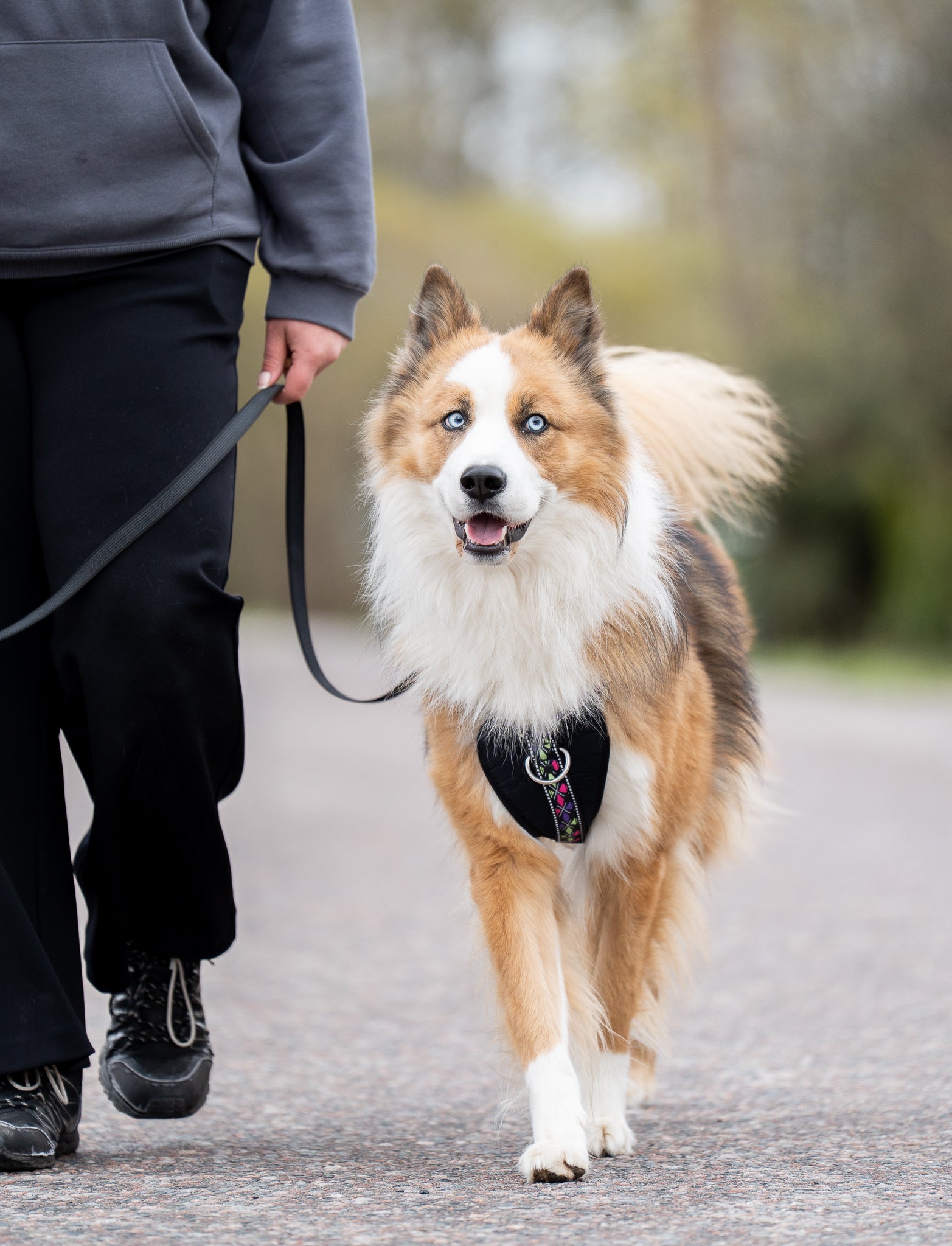 - sopivaksi säädetty valjas on koiralle napakka niin että sormesi mahtuvat valjaan nauhan ja koiran väliin