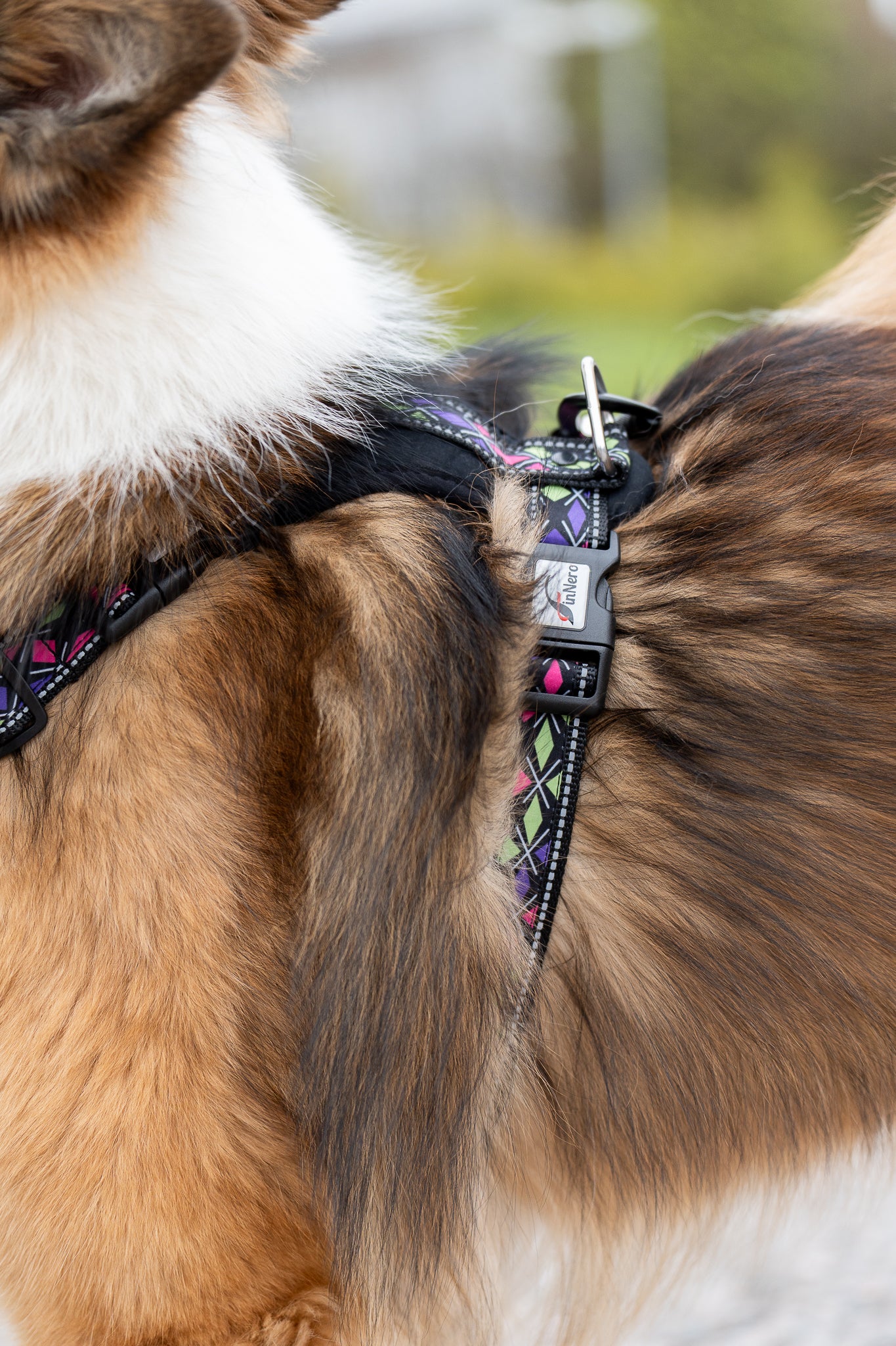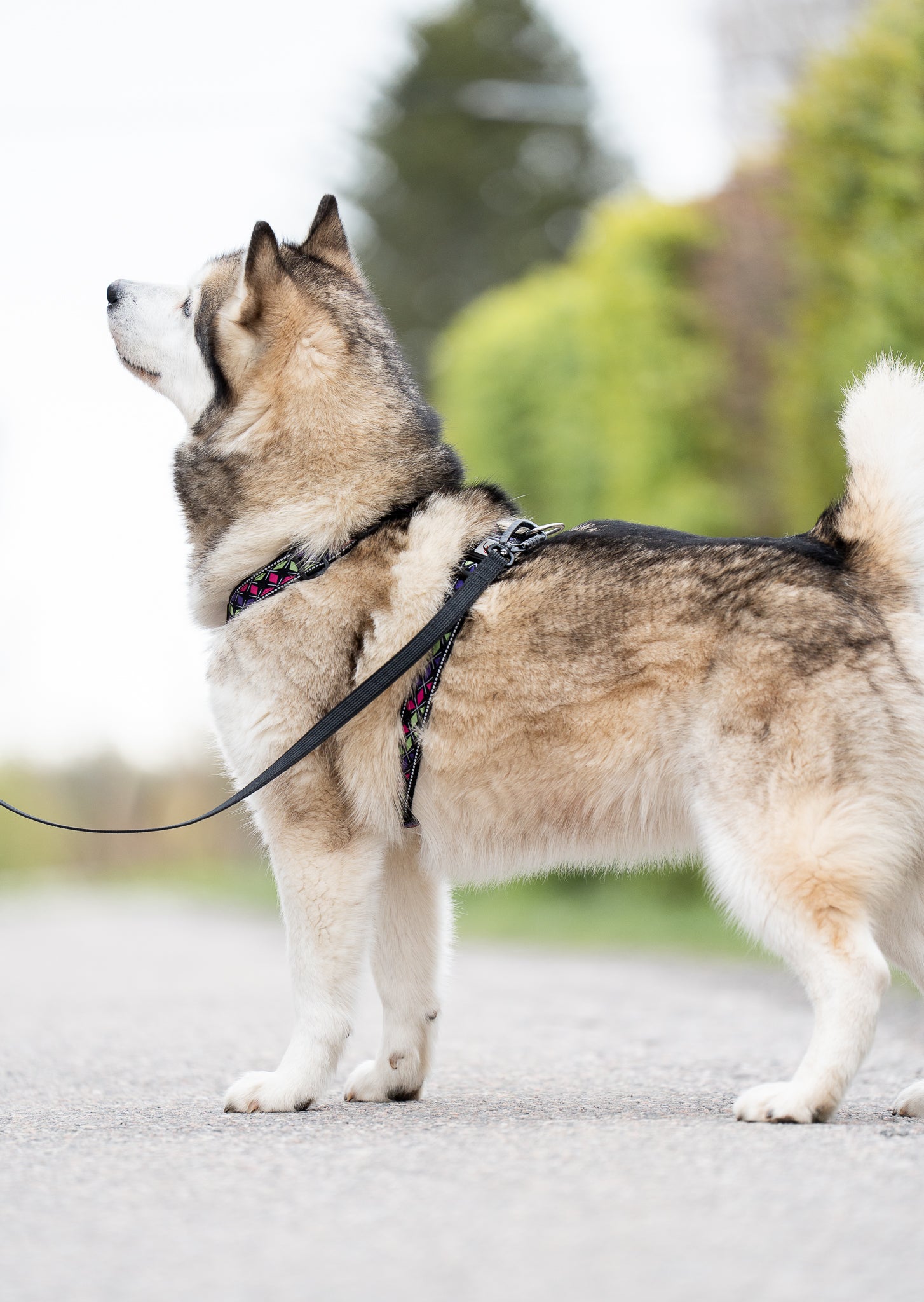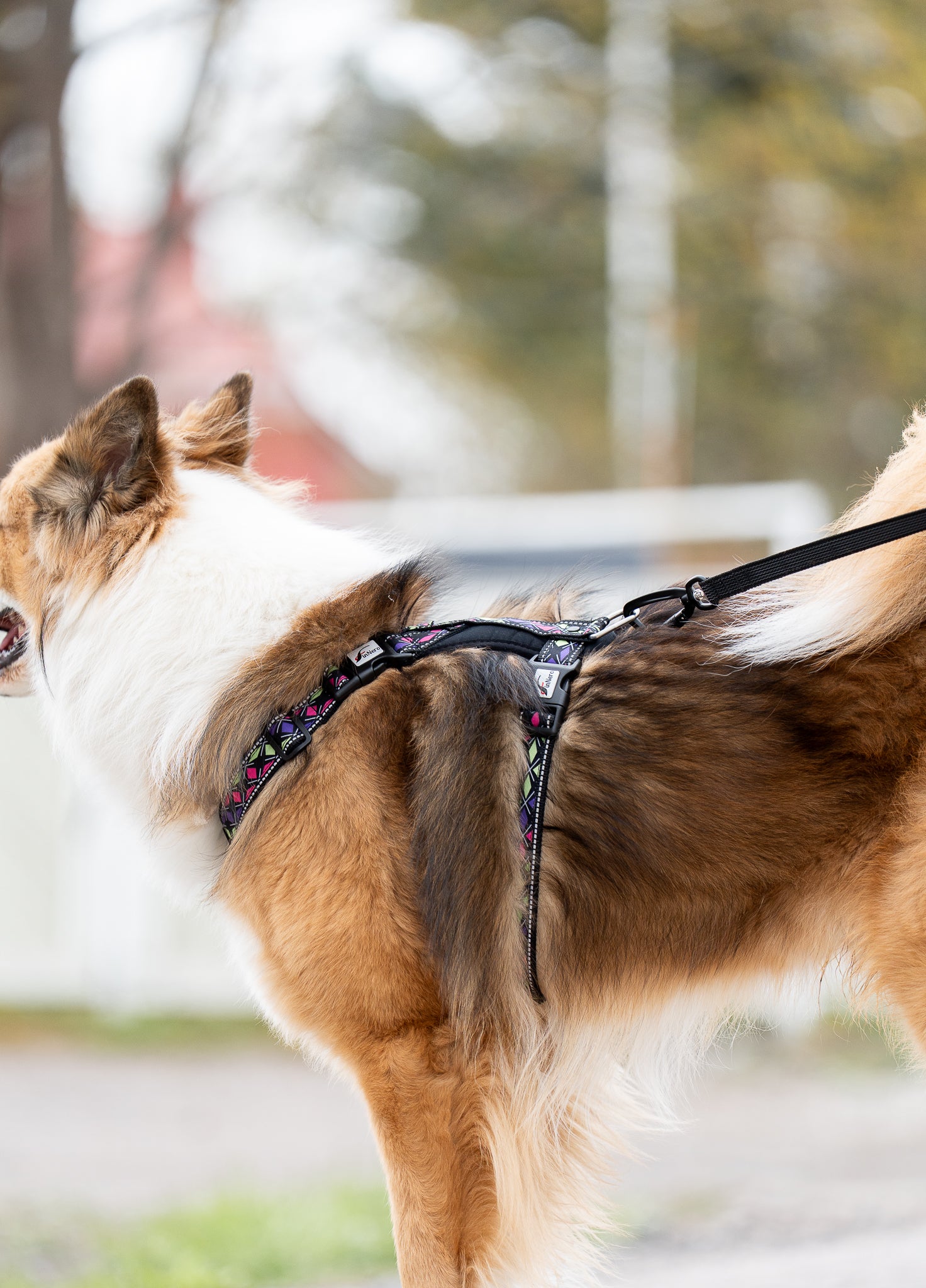 Edessä ja selän päällä on kantattu neopreeni-pehmuste, joka koiran vetäessä jakaa painetta koiran rintaosalla.