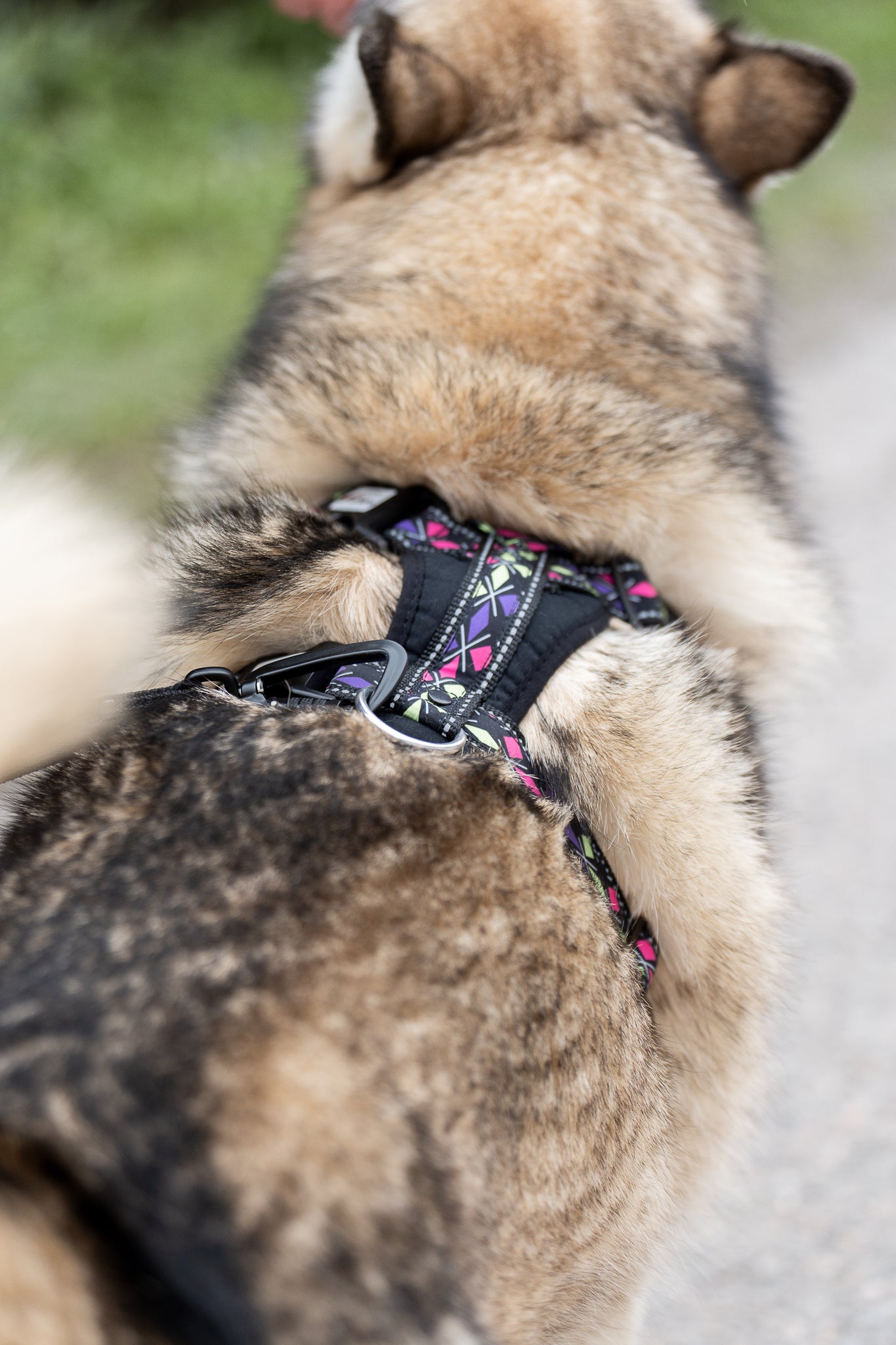 Matkalla kotiin -malliston RESCUE-valjas on helppo pukea, koska siinä on pikalukot niin pääntiellä kuin vyötäisilläkin. Pääntiellä olevan lukon ansiosta valjas sopii arallekin koiralle, joka ei ole tottunut pujoittamaan päätään läpi esim. valjaisiin.