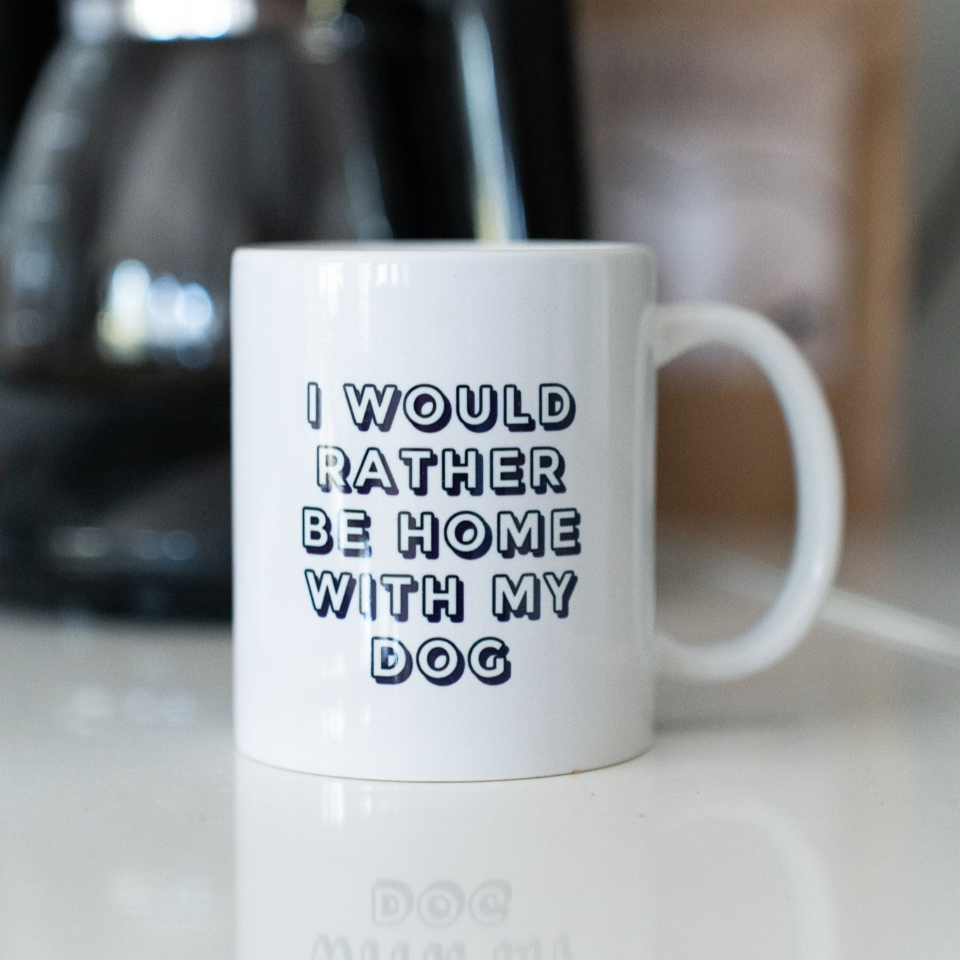Mukiin on painettu hauska teksti “I would rather be home with my dog” ja se on täydellinen aamukahville tai -teelle ja kokousjuomille erityisesti toimistolle jossa ymmärretään huumoria 🙂